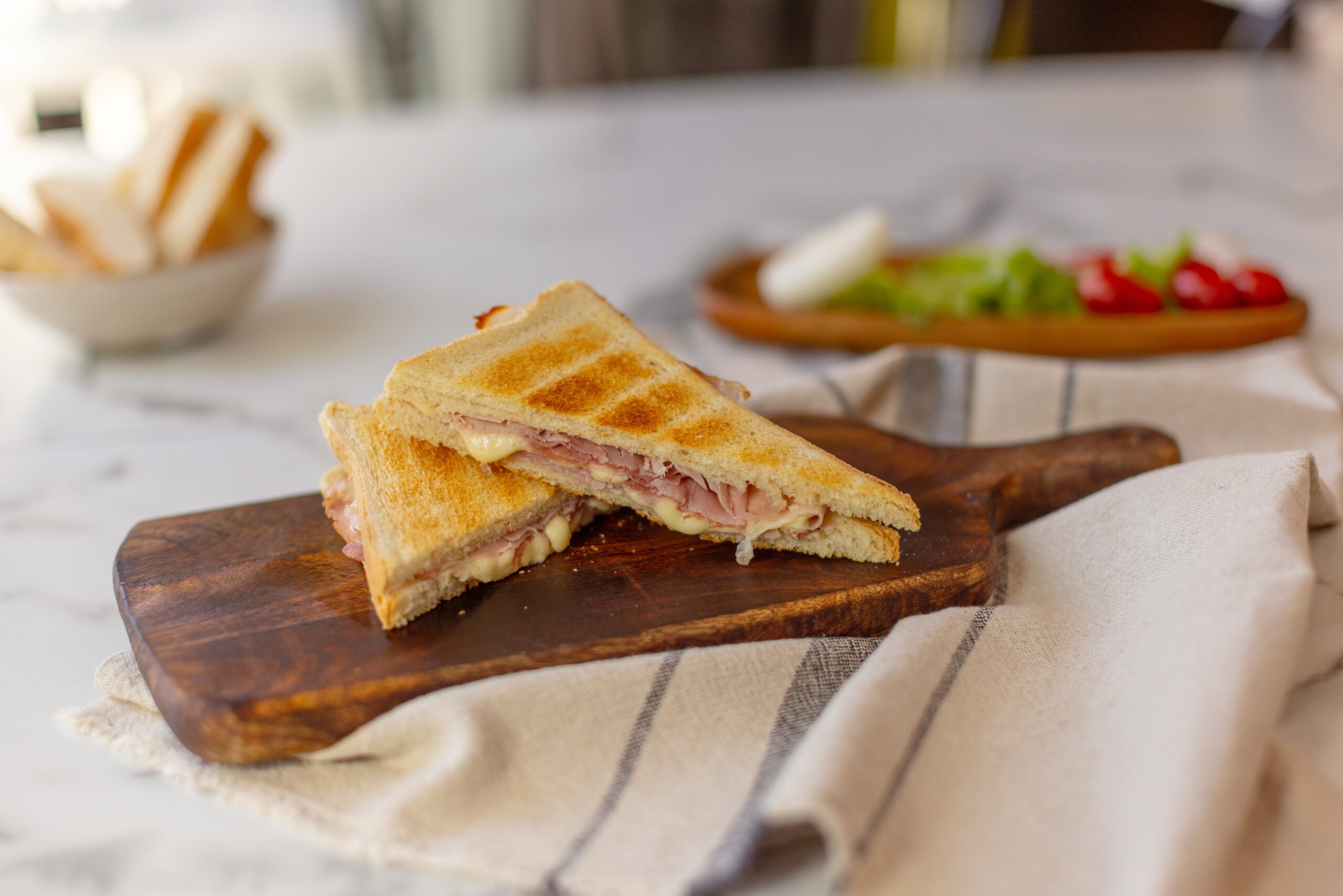 Tramezzino di tre strati con prosciutto cotto, pomodori, fontina, insalata e maionese. Servito con mini porzione di patatine fritte a parte