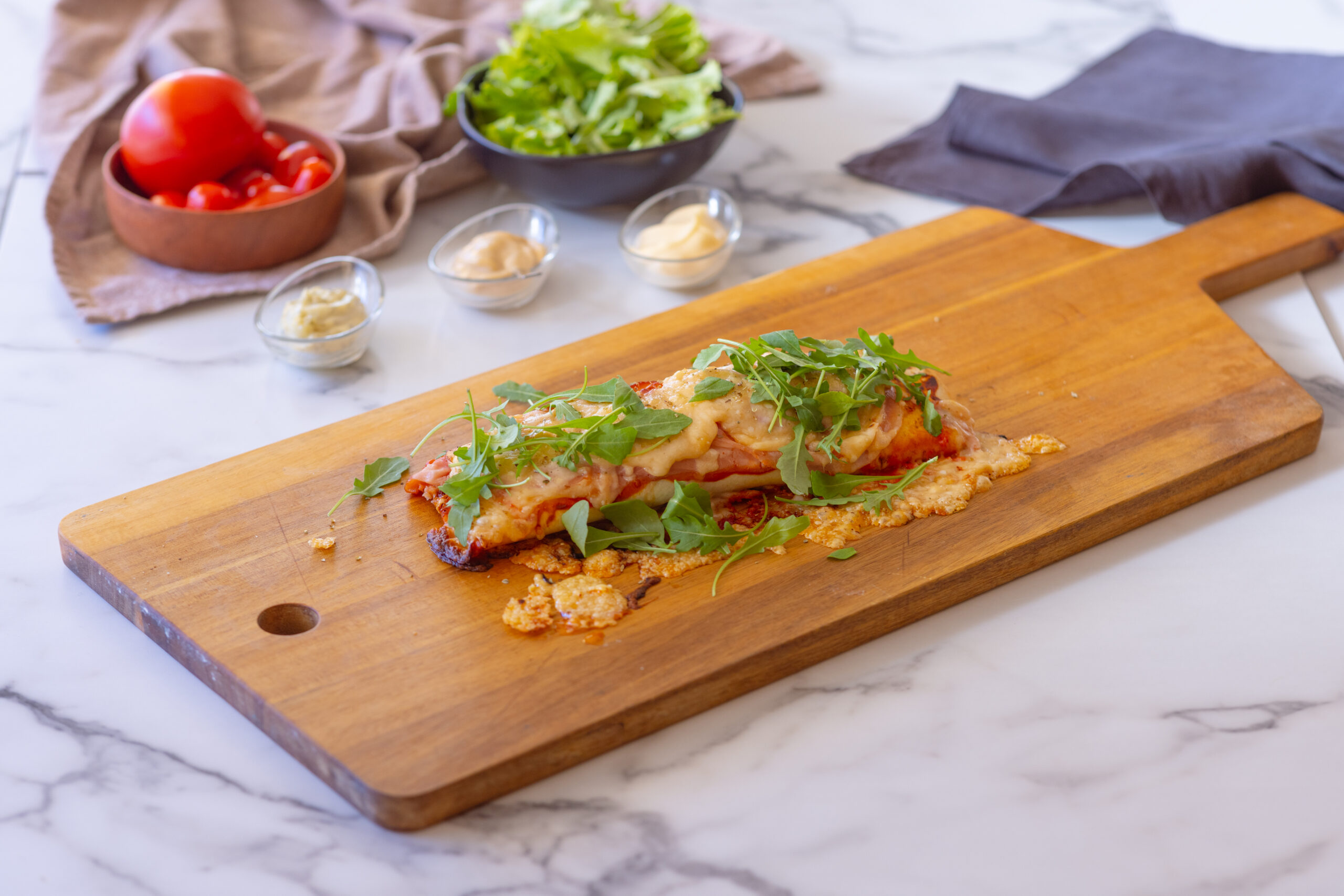 Piadina arrotolata con all’interno passata di pomodoro, mozzarella, prosciutto cotto e all’esterno ricoperta di Grana Padano fuso, origano e rucola.